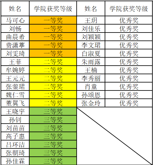 经过激烈角逐,马可心等5位同学荣获一等奖;王菲等6位同学荣获二等奖;王晓宇等7位同学荣获三等奖;其余同学为优秀奖。