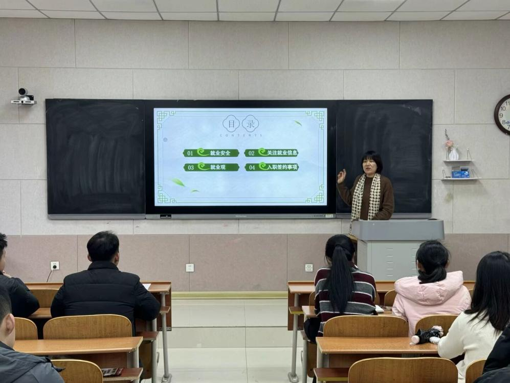 赵岩提醒同学们求职出行注意安全,防范交通事故和诈骗事件;明确论文检测等节点,介绍省网、国网就业系统使用,助力学生就业与毕业。