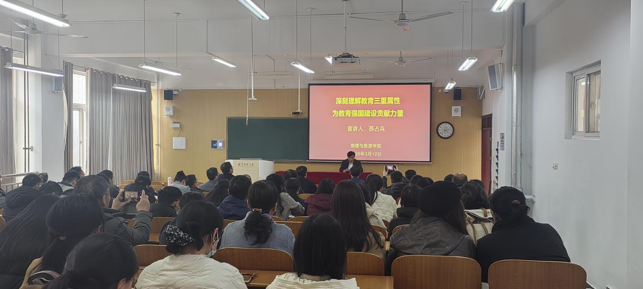 2025年3月12日下午,学院党委书记苏占兵以《深刻理解教育三重属性,为教育强国建设贡献力量》为题为全体教师上了一堂形势政策课。