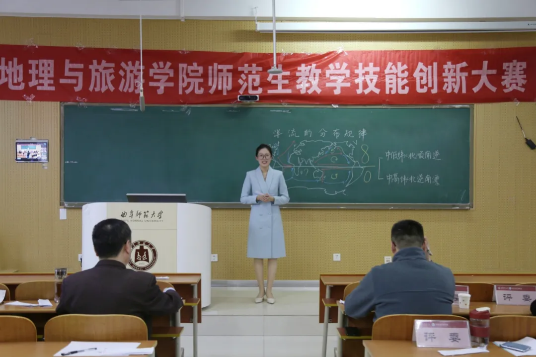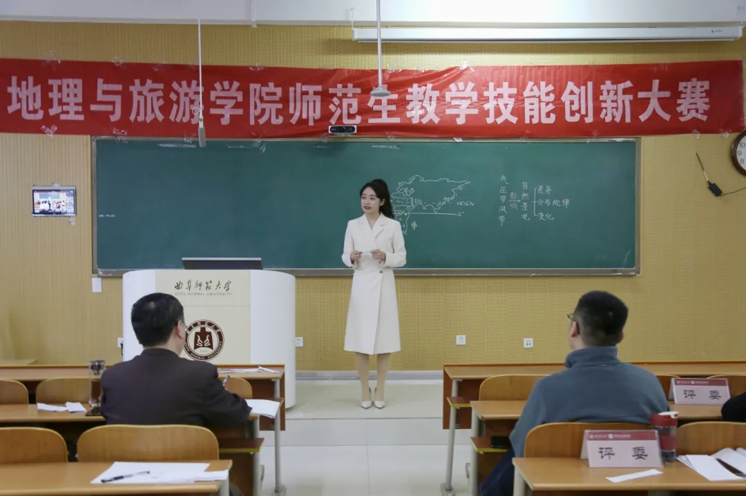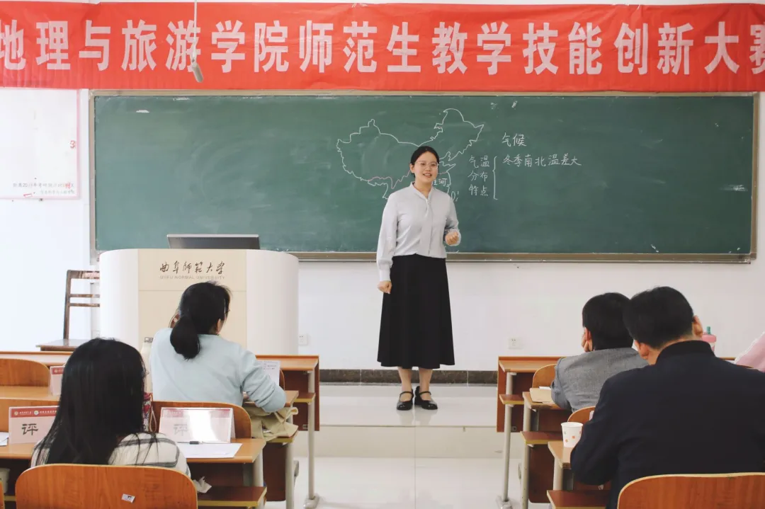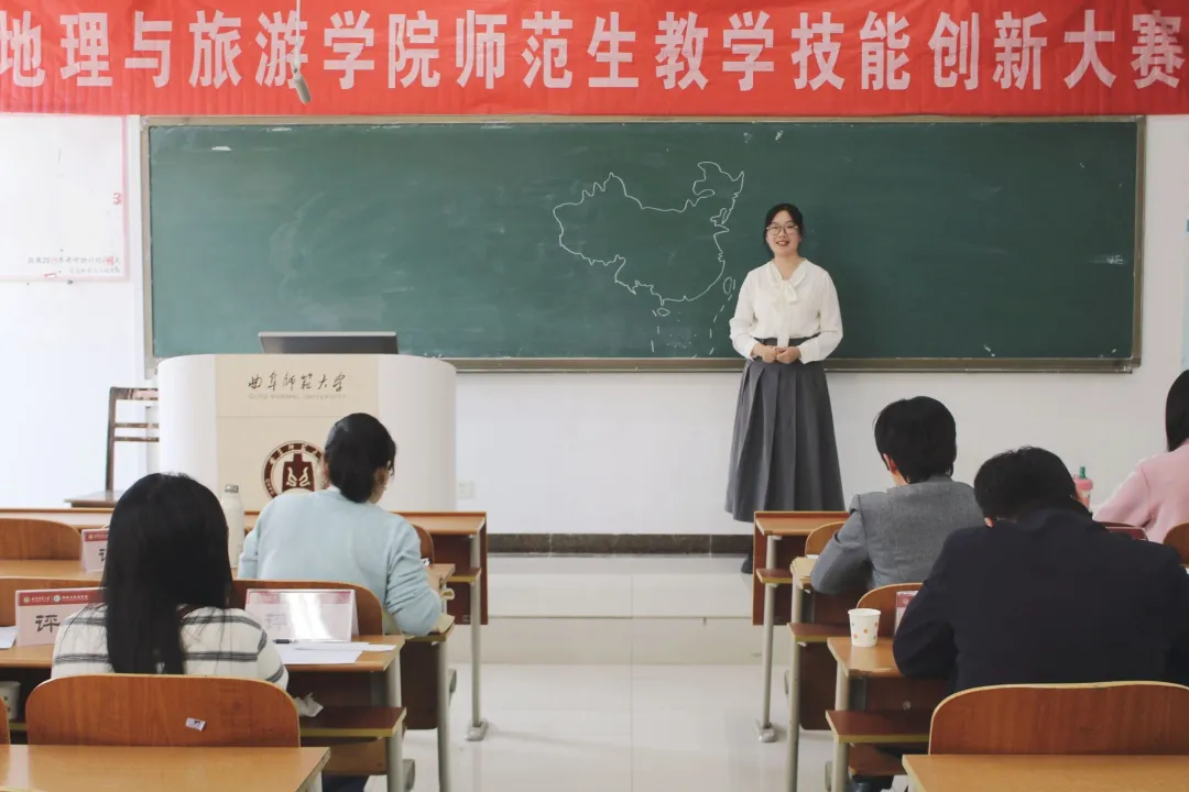 比赛项目分为10分钟模拟授课与现场5分钟答辩两个环节,综合考察选手的教学设计、课堂掌握度及临场发挥能力。模拟授课中,参赛者巧妙运用板书绘图、小组互动讨论等多元化教学手段,将热点元素与山河地貌的学科知识有机融合,打造出趣味性与专业性兼备的课堂。答辩环节,选手们从容应对随机抽取的教学情境题,结合教育理念与自身的实习经验,深入剖析学科核心素养的落实方法,展现出扎实的专业功底与创新的教学思维。