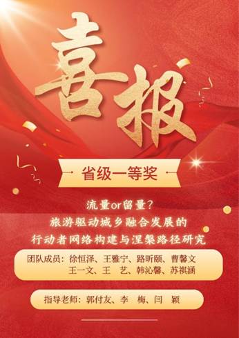 学子再创辉煌。《流量or留量?旅游驱动城乡融合发展的行动者网络构建与涅槃路径研究》项目由徐恒泽领队,在指导教师郭付友、李梅、闫颖的悉心指导下,队员们凭借出色的学术创新与实践能力,荣获省级一等奖,取得了近年来麻豆视频