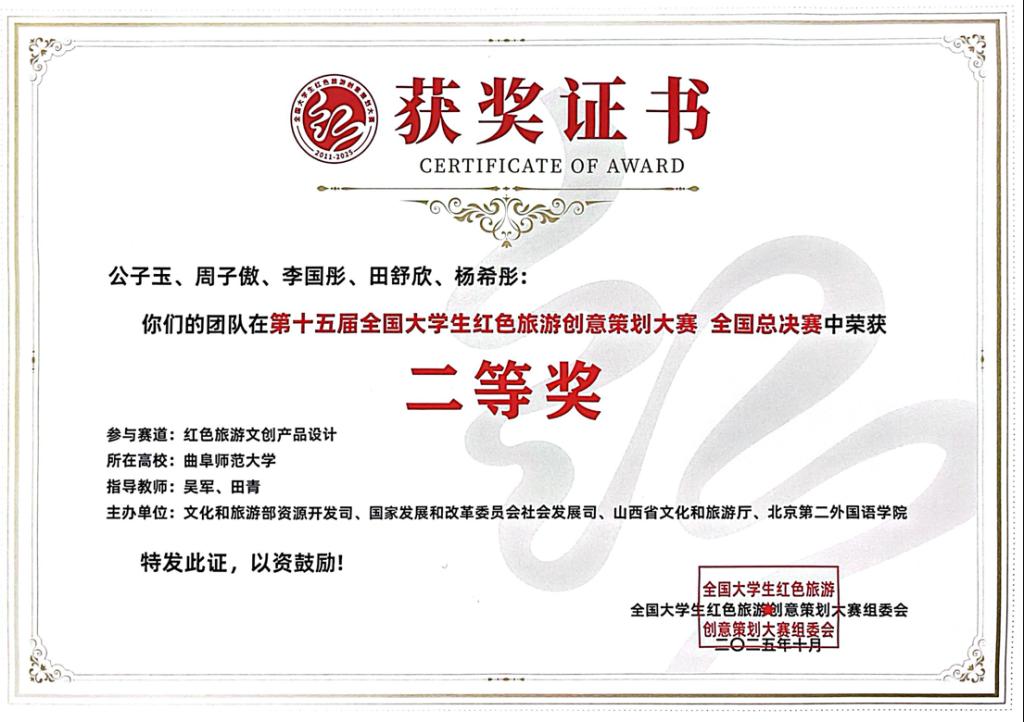 作为教育部全国大学生思想政治工作精品项目,本届大赛由文化和旅游部资源开发司、国家发展和改革委员会社会发展司等多部门联合主办,以“铸就红色理想,书写创意青春”为主题,聚焦纪念中国人民抗日战争暨世界反法西斯战争胜利80周年,设置“红色旅游线路设计”“红色旅游营销方案设计”“红色旅游文创产品设计”“红色足迹微视频”“红色精神微讲解”“红色故事微漫画”六大赛道。大赛共吸引包括北京师范大学、华东师范大学、中山大学等高校在内的1001所高校、6002支队伍、3万余名师生积极参与,累计收到参赛作品5144项。赛事采用“初赛+决赛”两级选拔机制,各赛道仅前10名作品可晋级总决赛,整体入选率低至1.17%,竞争异常激烈。总决赛期间,60支入围队伍聚焦武乡丰富的红色资源,通过情景展示、视频路演等创新形式,为当地红色旅游发展注入青春智慧。其中,由吴军、田青老师指导的作品《延脉相承,红色铸魂》和《太行军武智玩》(学生团队:公子玉、周子傲、李国彤、田舒欣、杨希彤)以优异成绩获“红色旅游文创产品设计赛道”二等奖,吴军、田青老师分别获最佳指导教师奖。公子玉同学作为参赛代表队伍接受中国旅游报的采访,充分彰显麻豆视频
