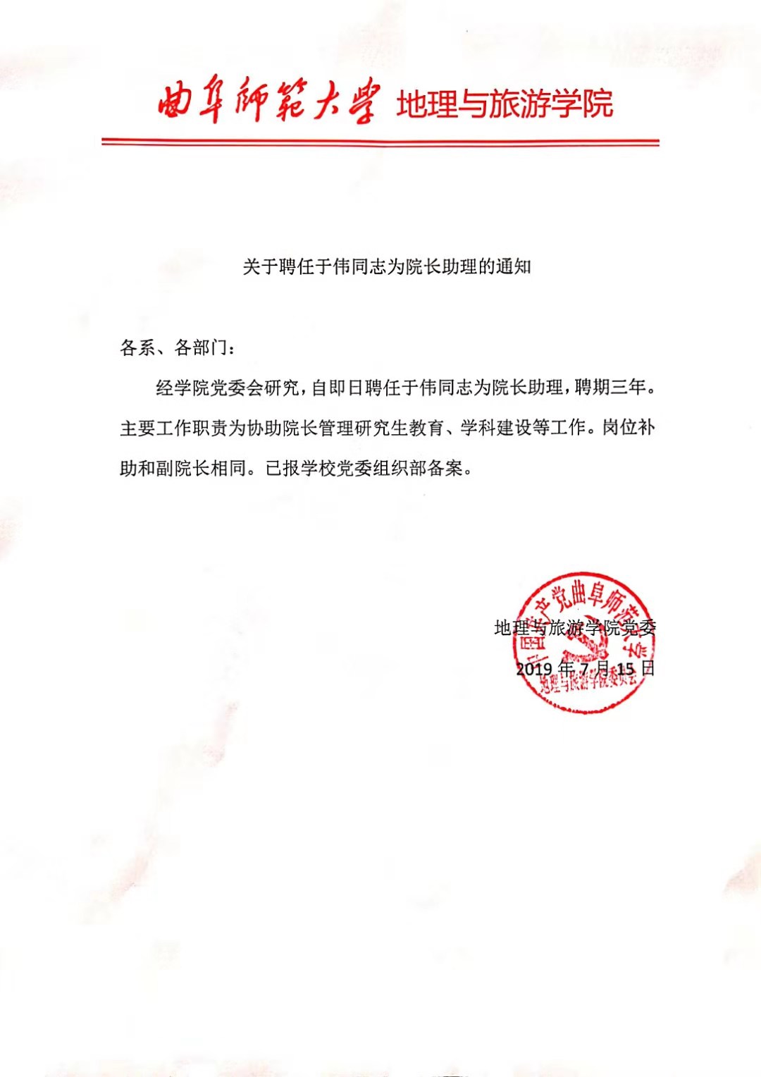 关于聘任于伟同志为院长助理的通知